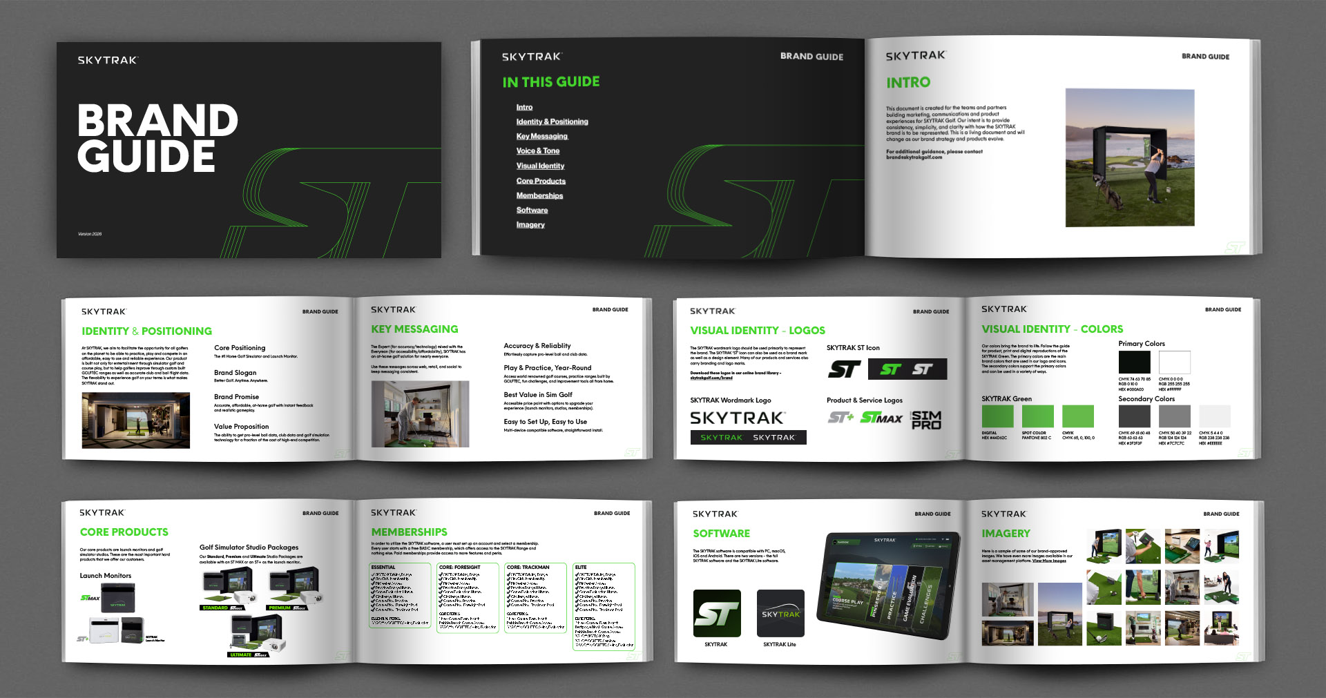 The brief: Update and define the SKYTRAK brand system including copy tone, updated color palette, logo guidance, fonts and create a new brand guide to present all the updated material.